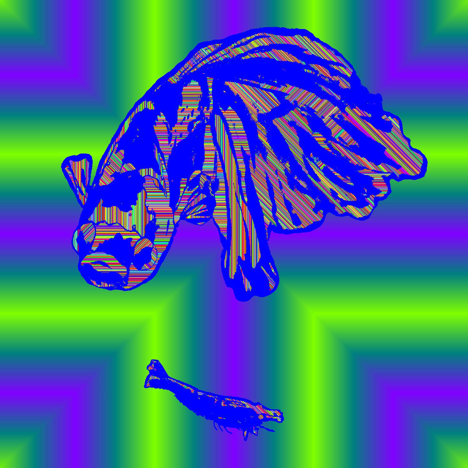 Leo Angry At Shrimp With Blue Outline On Plus Purple Background With Stripe Pattern.