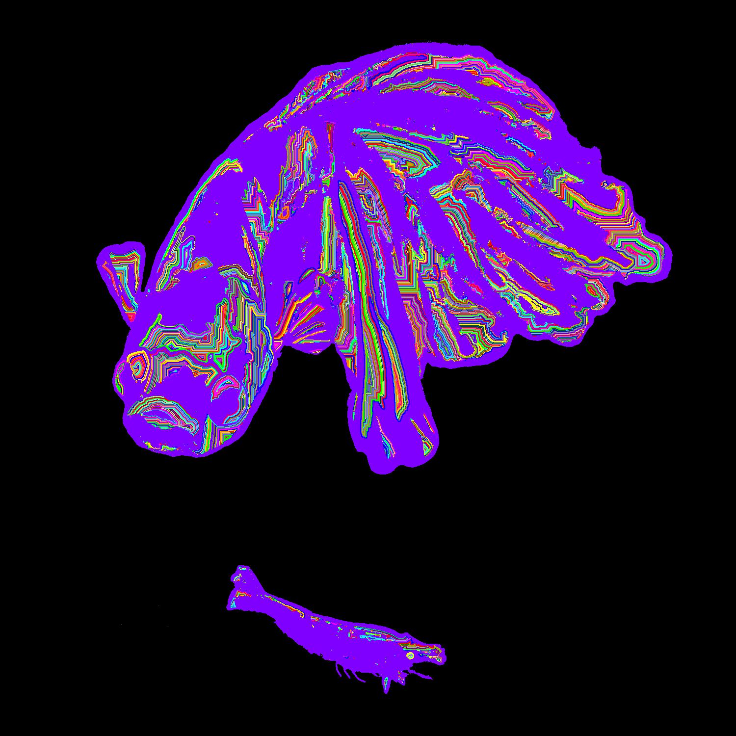Leo Angry At Shrimp With Purple Outline On Solid Black Background With Edge Pattern.