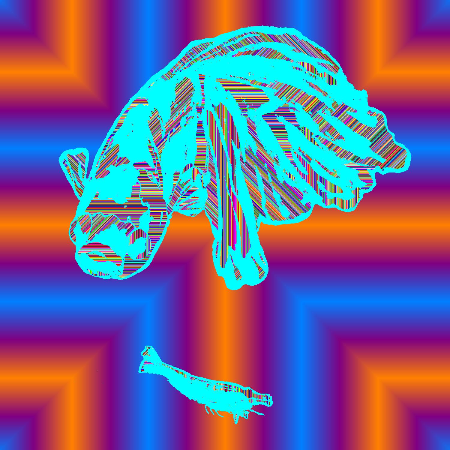 Leo Angry At Shrimp With Lightblue Outline On Plus Orange Background With Stripe Pattern.