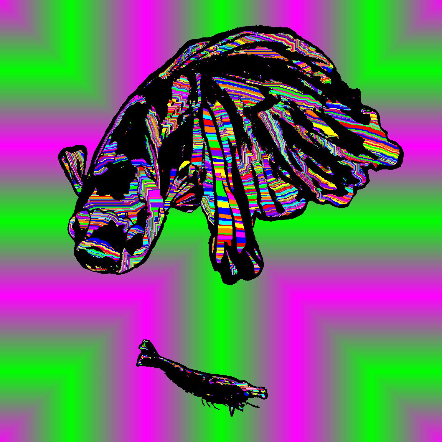 Leo Angry At Shrimp With Black Outline On Plus Green Background With Snake Pattern.