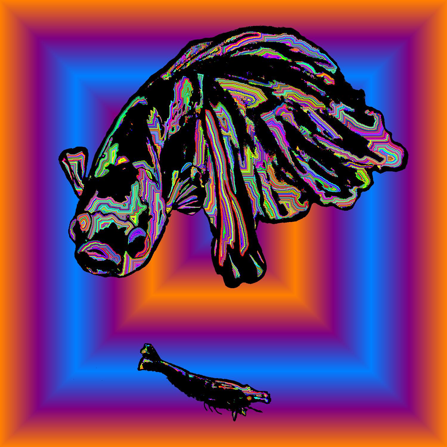 Leo Angry At Shrimp With Black Outline On Halo Orange Background With Edge Pattern.