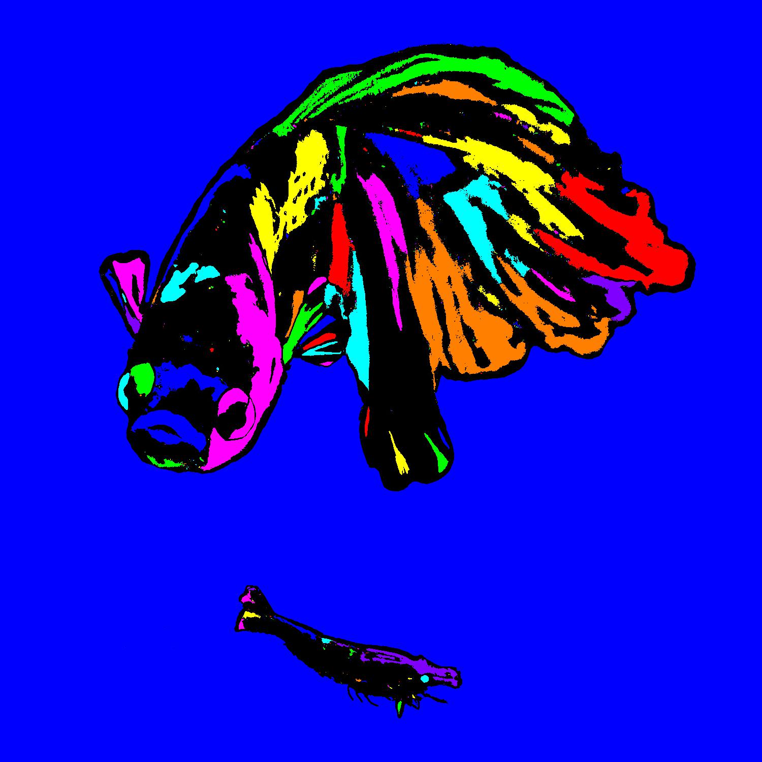 Leo Angry At Shrimp With Black Outline On Blue Background.