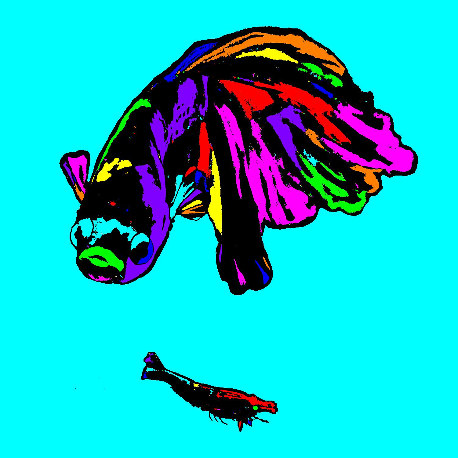 Leo Angry At Shrimp With Black Outline On Lightblue Background With Fill Pattern.